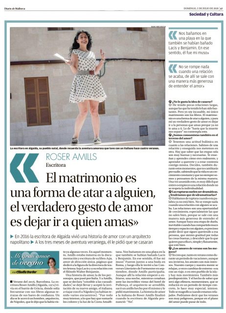Una historia de amor, la de los personajes, que pasó por Italia. Y a Amills, que se declara «sensible a las casualidades», se dejó llevar y aceptó la invitación de su nuevo amigo, el italiano, a viajar con él a Nápoles (ya habían tenido varios encuentros). «Fue todo muy intenso, a lo que hay que sumarle los colores y la luz de la Costa Amalfitana. Nos bañamos en una playa en la que también se habían bañado Lacis y Benjamin. En ese sentido, él fue mi muso». Fueron juntos a una boda en Roma, y luego ella le invitó a las Converses Literàries de Formentor en septiembre, donde Amills participaba. Aunque allí la relación empezó a enfriarse, una noche, mientras cenaban ante las increíbles vistas del hotel de Pollença, el arquitecto se arrodilló, sacó un anillo hecho por él mismo y le pidió matrimonio. La historia de amor a la italiana de Roser Amills finalizó cuando la escritora de Algaida pronunció: «No».