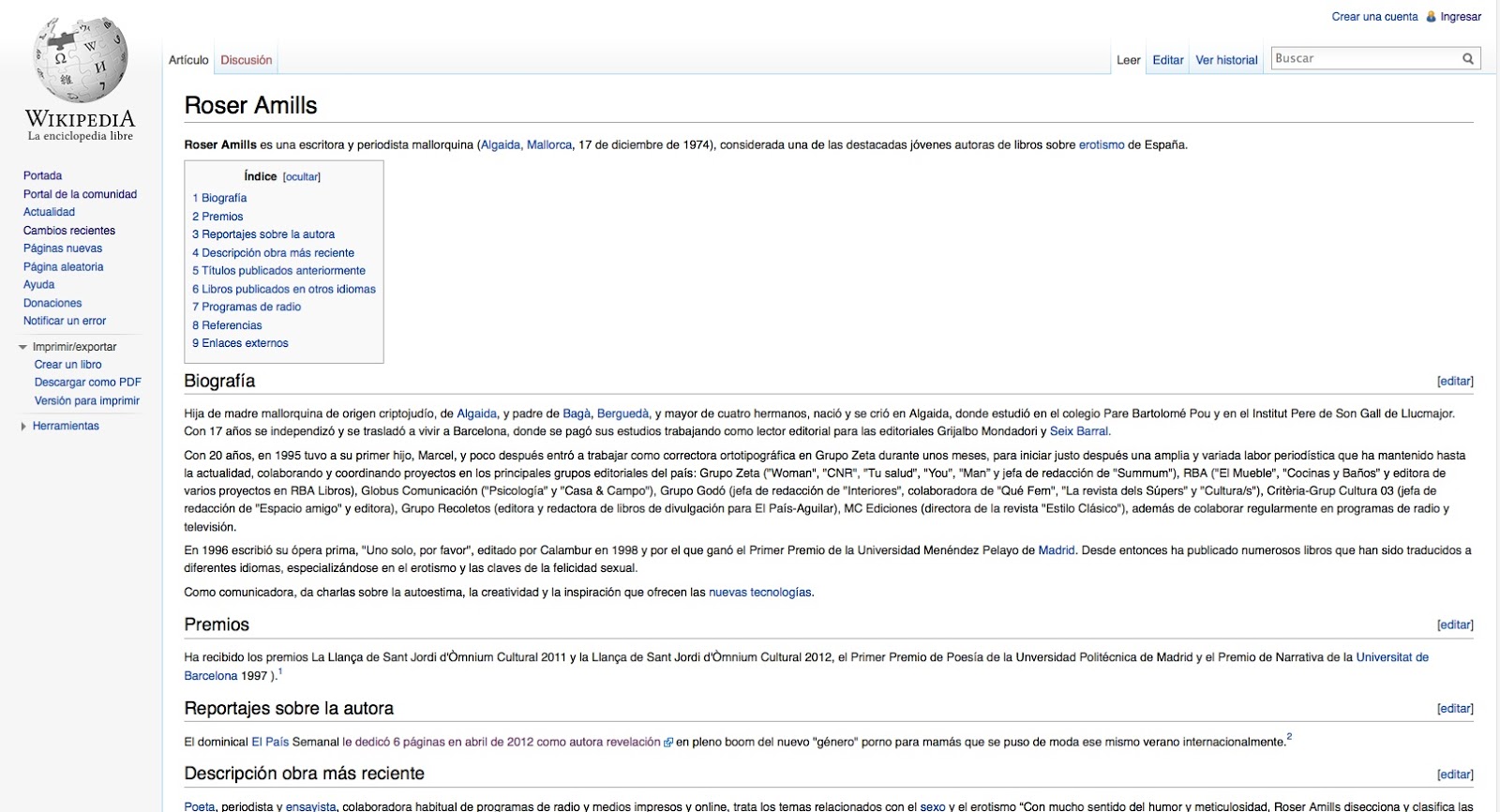 - ? «Entrevista a la escritora Roser Amills» (en castellano). Diario de Mallorca (27-03-2012). Consultado el 7 de febrero de 2013. «Roser Amills, nacida en Algaida y residente en Barcelona desde 1992, es autora de uno de los éxitos de este Sant Jordi: ´1001 fantasías más eróticas y salvajes de la historia´, un libro que recopila las fantasías sexuales de famosos de todos los ámbitos.».